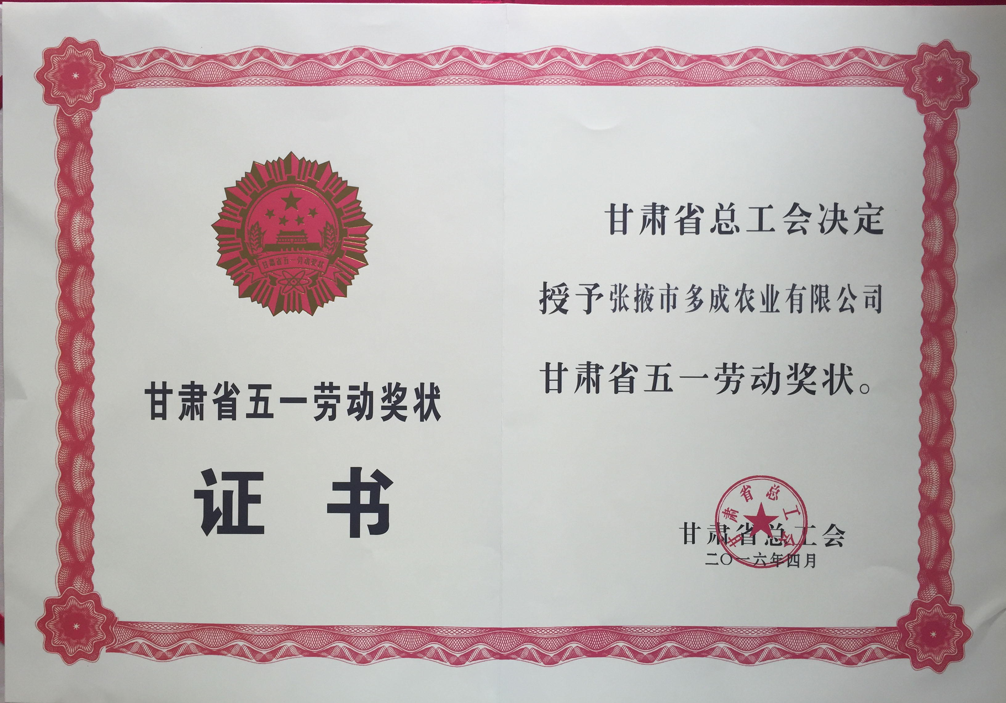張掖市多成農(nóng)業(yè)有限公司經(jīng)張掖市工會推薦,榮獲2016年度甘肅省五一勞動獎狀。